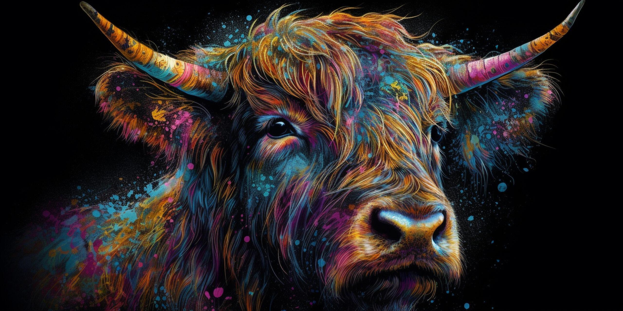 Highland cow in vibrant neon colors and flower petals isolated on black with a retro style